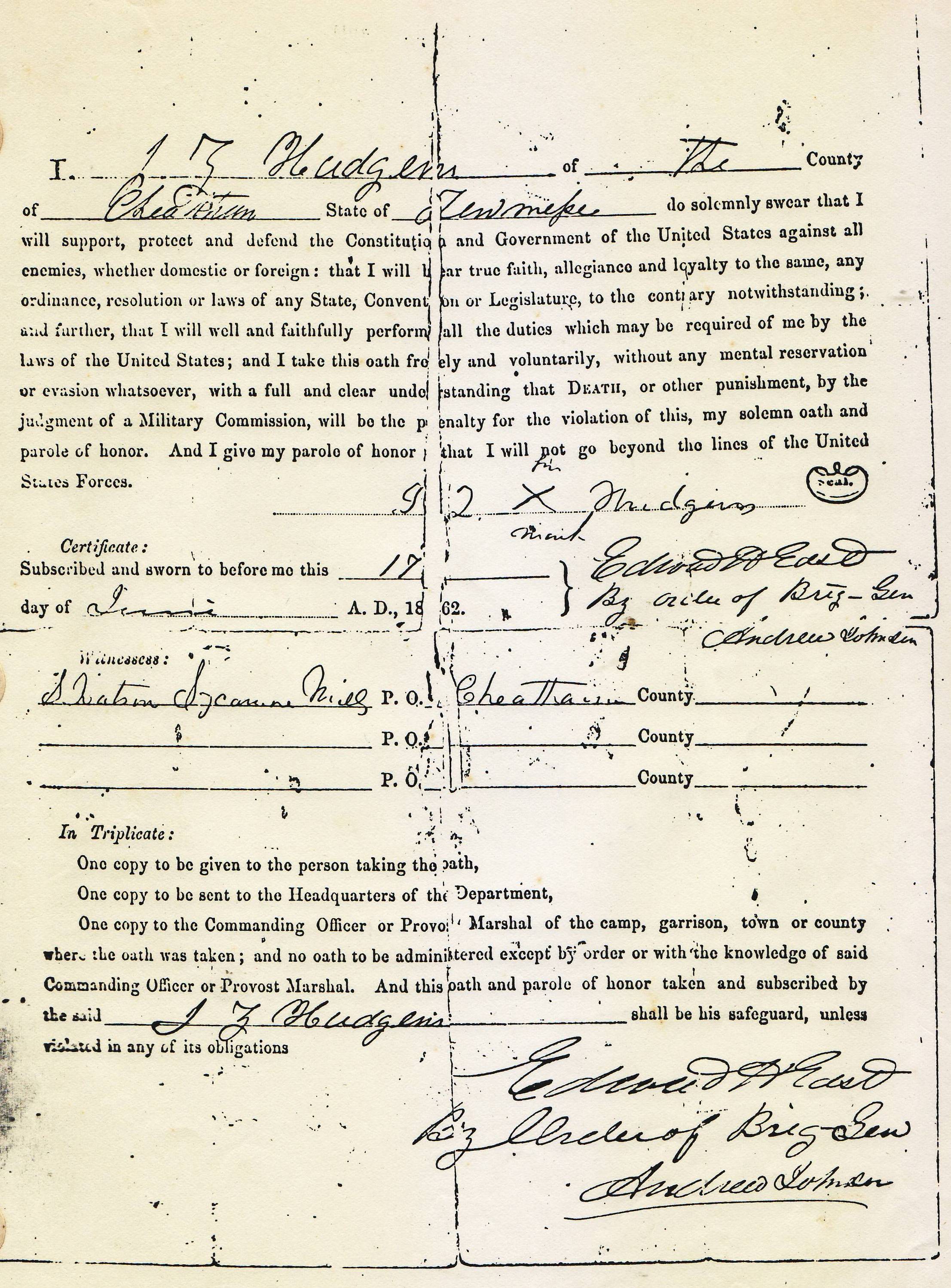bacharltonoriginally submitted this to Fromme Family Treeon 15 Jan 2011Category Type: Document / CertificateDocument is signed by Signed by Edward H. East who was the Tennessee Secretary of State, "By Order of Brig. Gen. Andrew Johnson" who was then Military Governor of Tennessee. Both East and Johnson were opposed to secession.Transcription of text in documentSigned 17 Jun 1862 in Cheatham County, Tennessee. From Wikipedia.org: "During the American Civil War, political prisoners and prisoners of war were often released upon taking an "oath of allegiance". Lincoln's Proclamation of Amnesty and Reconstruction featured an oath to 'faithfully support, protect and defend the Constitution of the United States, and the union of the States thereunder' as a condition for a Presidential pardon."