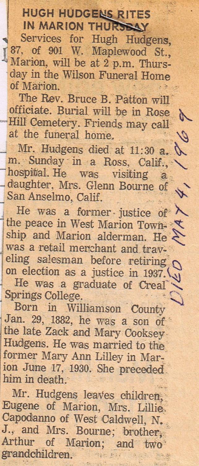 HUGH5 HUDGENS(ZACHARIAH4, JOHN THOMAS3, JAMES2, JAMES1) was born 29 Jan 1882 in Williamson Co.IL, and died 04 May 1969 in Ross CA.