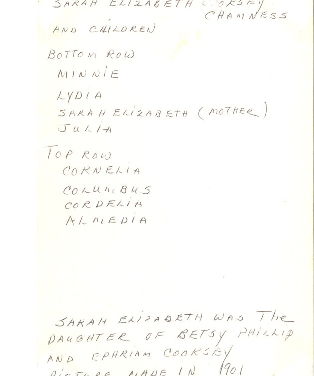 Chamness, Sarah Elizabeth aged resident of Williamson County passed away at the home of her daughter, Mrs. Nelia Simmons in Miami, Florida, Sunday Noon April 26, 1926 following an extended illness.  The deceased was born in Smith County, Tennessee on April 28, 1843 and at the time of her death was 82 years, 11 months and 28 days of age.  She was the daughter of Ephriam J. and ELizabeth (Phillips) Cooksey and was educated in the common schools of this county moving to Illinois with her parents in early childhood. In November 1862 she was united in marriage to John Chamness and to this union fifteen children were born, five survive their mother, namely Mrs. Allen Julia Suratt of Chamness, Mrs. Joel (Lydia) Norris of Marion, Mrs. A.J. (Minnie) Starrick of Marion, E.M. Chamness of Miami, Florida and Mrs. Nelia Simmons of Miami.  Her husband preceded her in death. She is also survived by two brothers, John A.