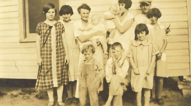 Delia,Helen,Alice holding RayGene,Robt D Jr held by Doris,Dean,AngieJohn,Bill,Lorraine 1925