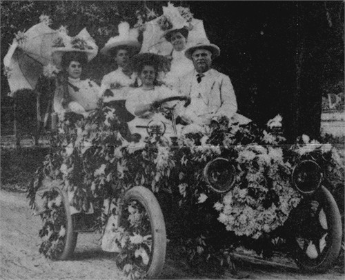 E E Skipper at right, his daughter-in-law, Ruth Knight Skipper, at the right-hand steering wheel and three of their friends (according to newspaper caption). The woman behind EE Skipper is his daughter, Blanche Skipper Douglas, identified by Martha Camm. The date of the photo may be incorrect, or Ruth Knight Skipper would not have been married yet. The other 2 women are unidentified. This photo was found in an old newspaper clipping and was supposedly taken in 1909. However, Ruth Knight did not marry Milton Skipper, Jr. until 1916. Perhaps the date is correct and Ruth Knight was not yet married.