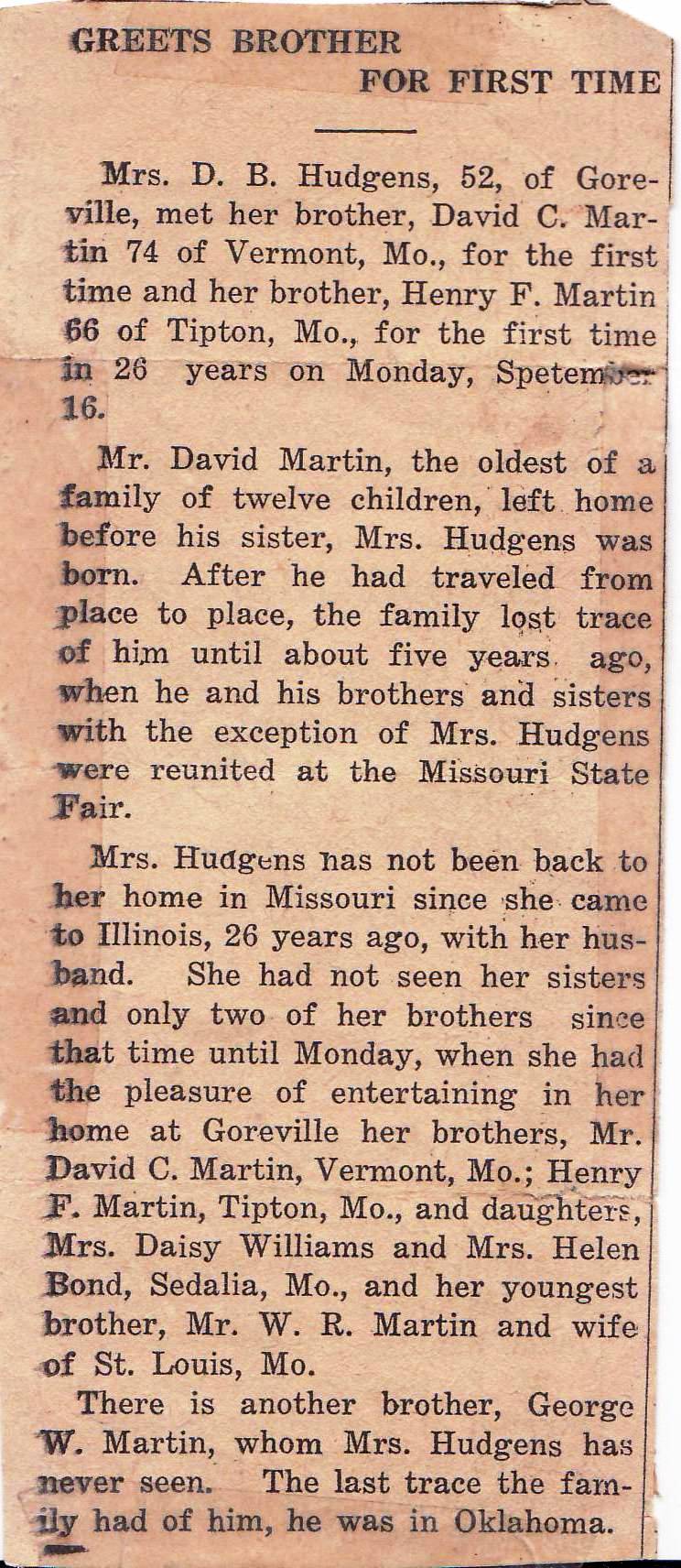 ALICE JOSEPHINE2 MARTIN (JOHAN JOHN JACOB1) was born 16 Dec 1882 in Lone Elm Boone County Missouri, and died 04 Mar 1958 in Marion Williamson Co.IL. She married DANIEL BOONE HUDGENS 01 Sep 1909 in Clayton MO, son of WILLIAM HUDGENS and ADELIA COOKSEY. He was born 09 Aug 1872 in Chamnesstown Cooksey Dist.Williamson Co.IL, and died 25 Aug 1962 in Marion Williamson Co.IL.February 17, 2014 2 Comments